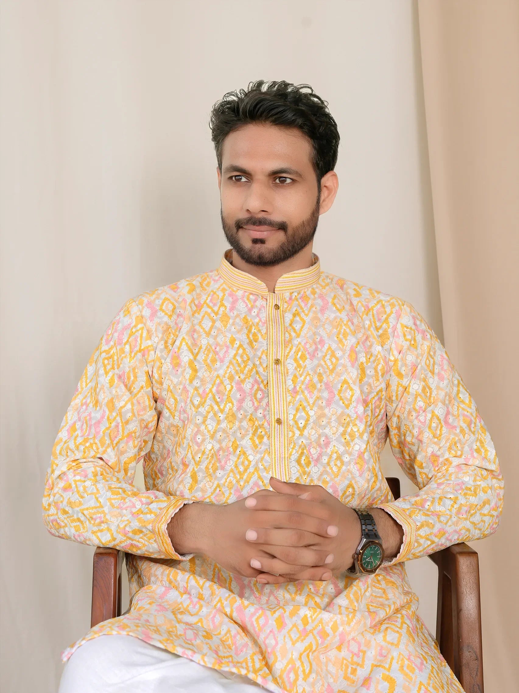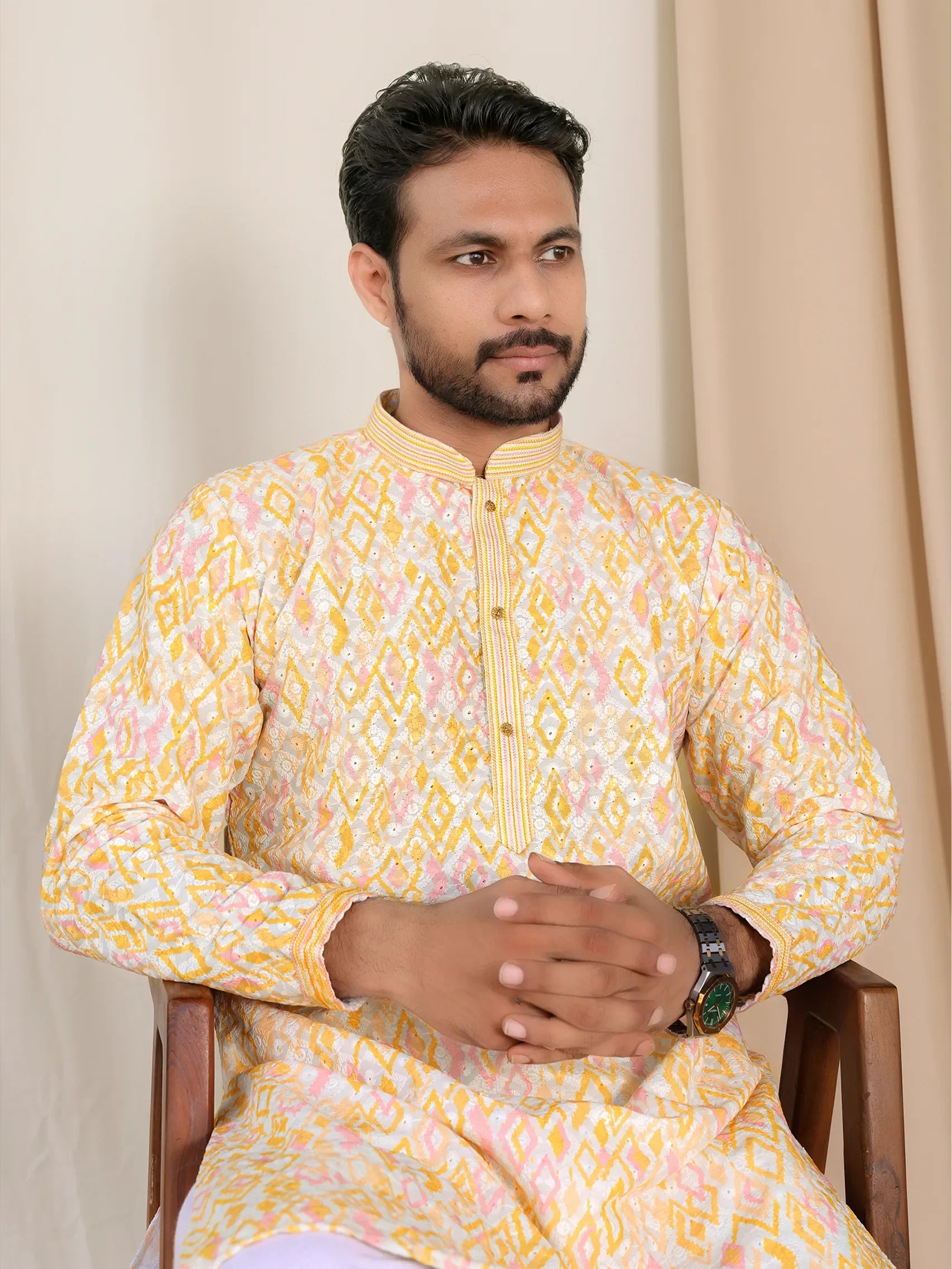 Light Yellow Geometric Kurta for Men – Lucknowi Work & Contrast Print | Wedding & Festive Wear