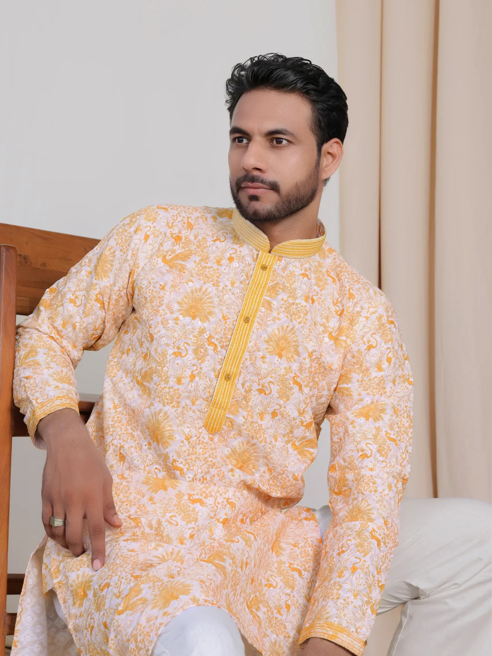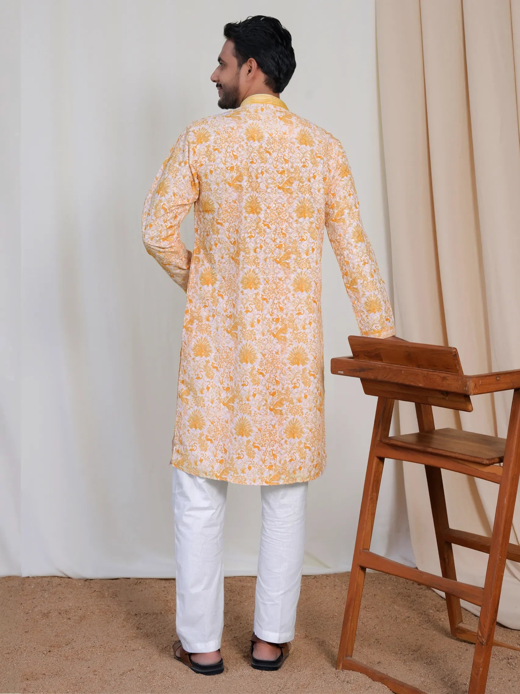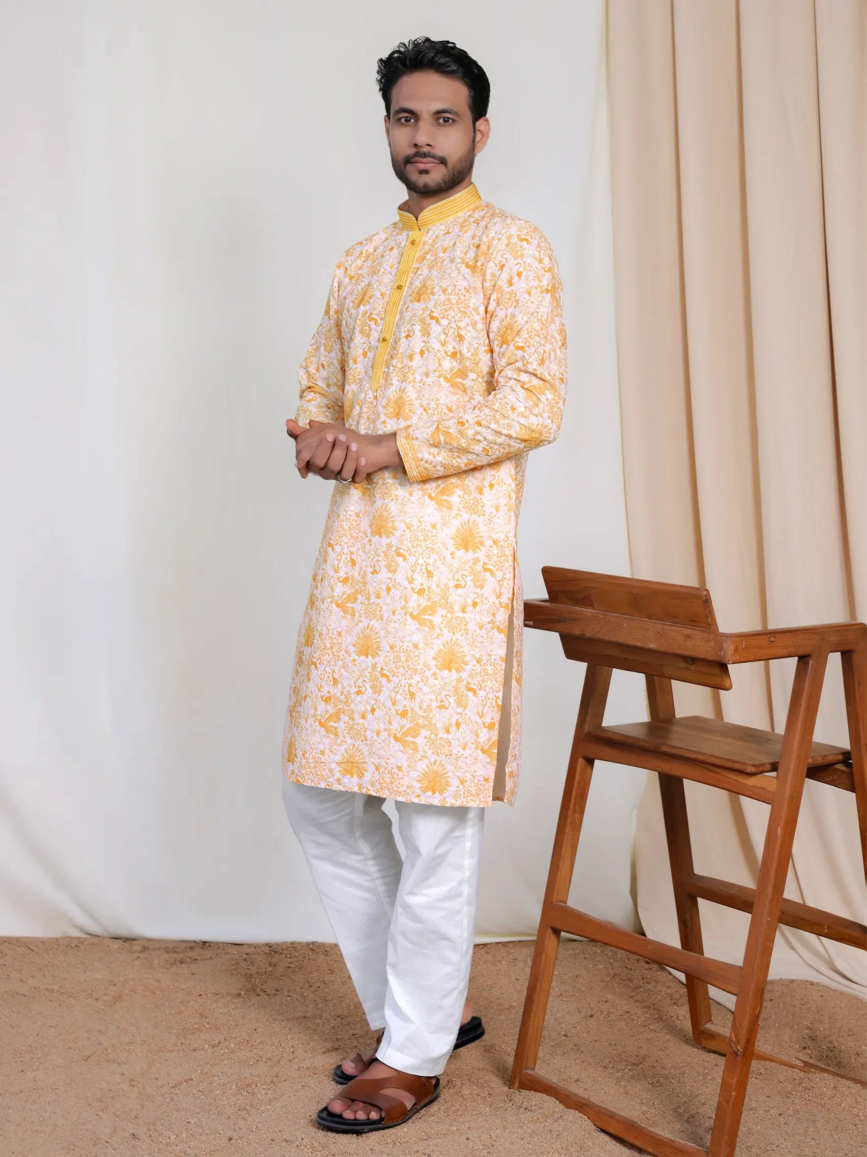 Yellow Floral Kurta for Men – Lucknowi Work & Contrast Print | Wedding & Festive Wear