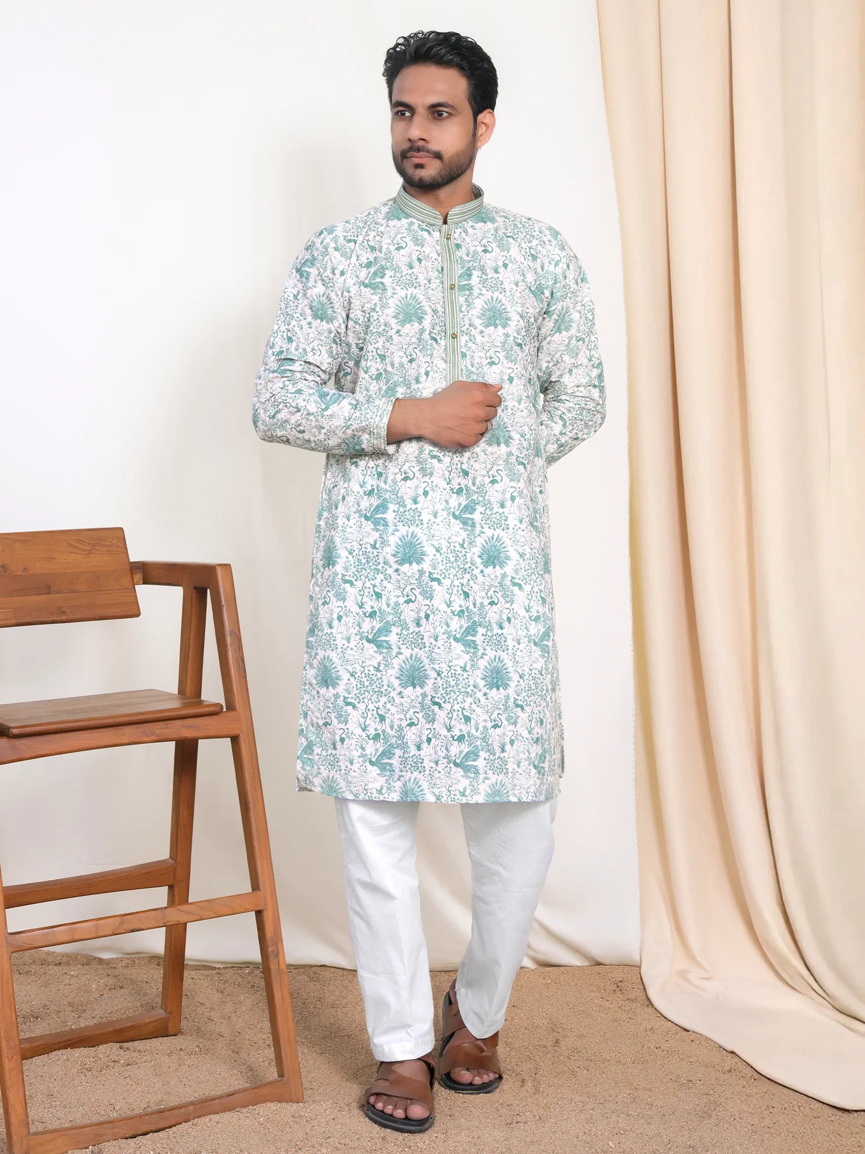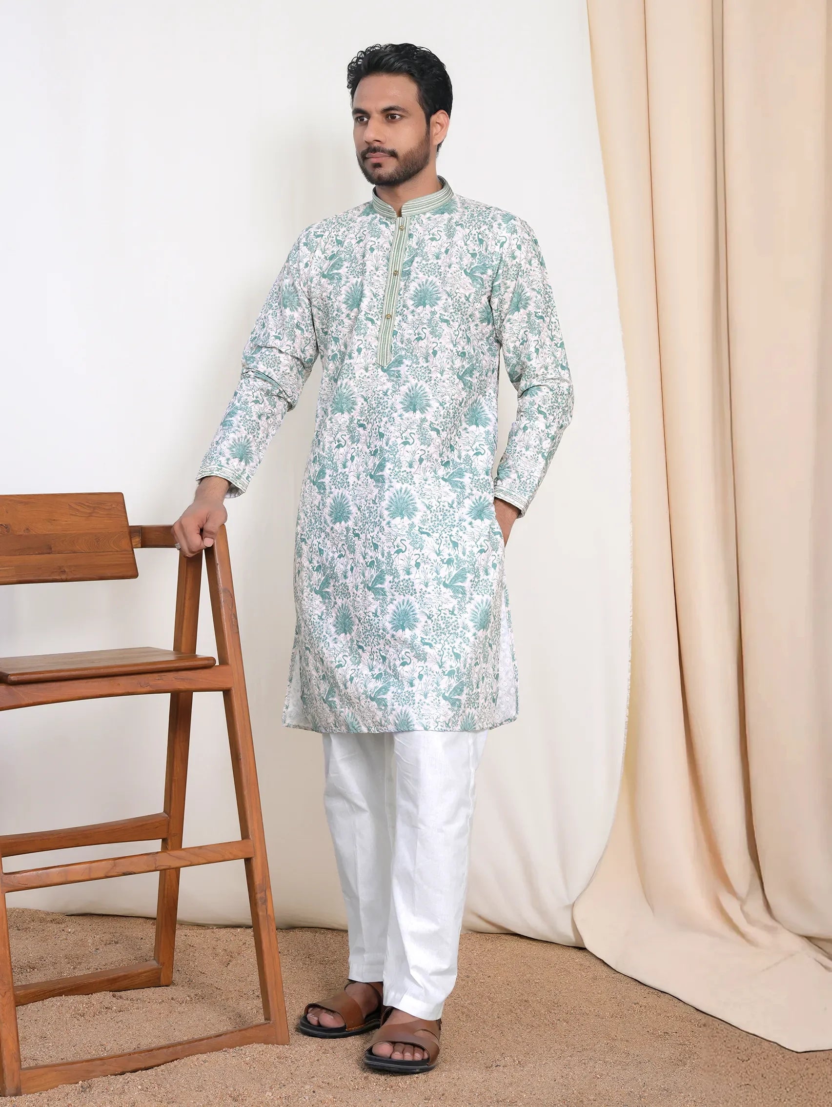 Light Green Floral Kurta for Men – Lucknowi Work & Contrast Print | Wedding & Festive Wear
