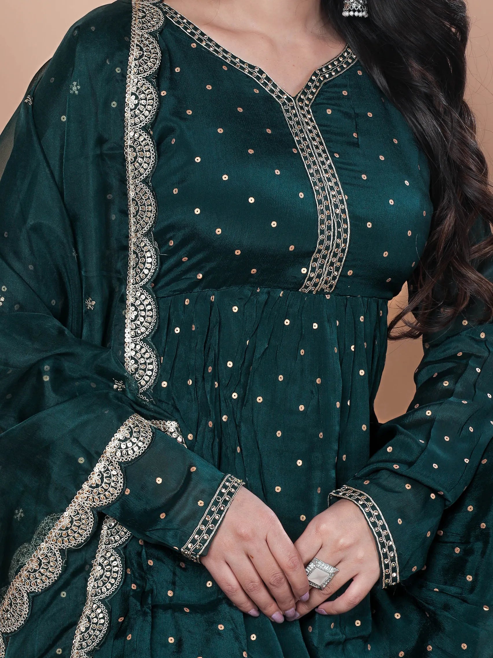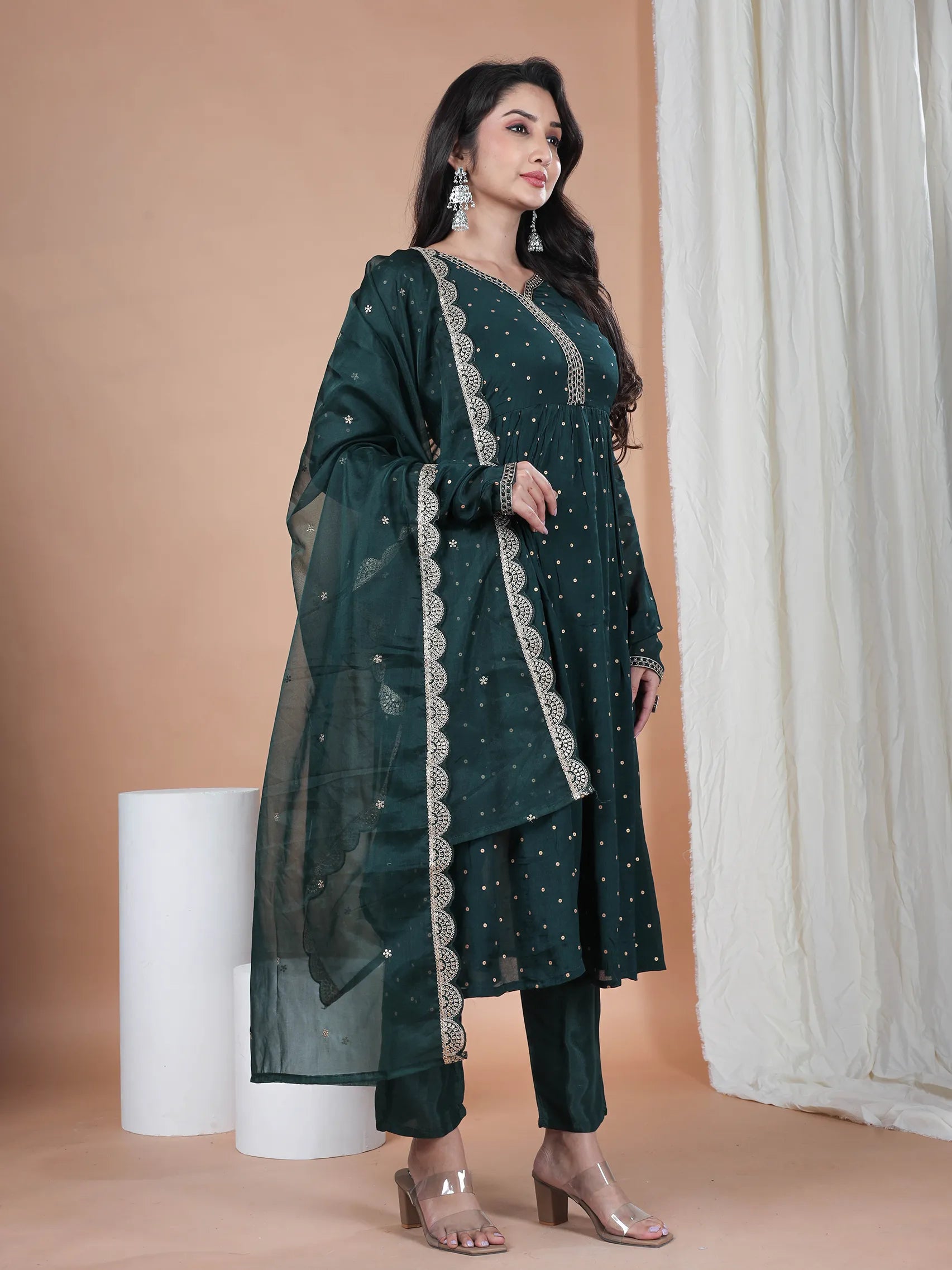 Dark Green Chinon Viscose Kurta Set with Embroidery & Chanderi Dupatta | Full Sleeve Ethnic Wear